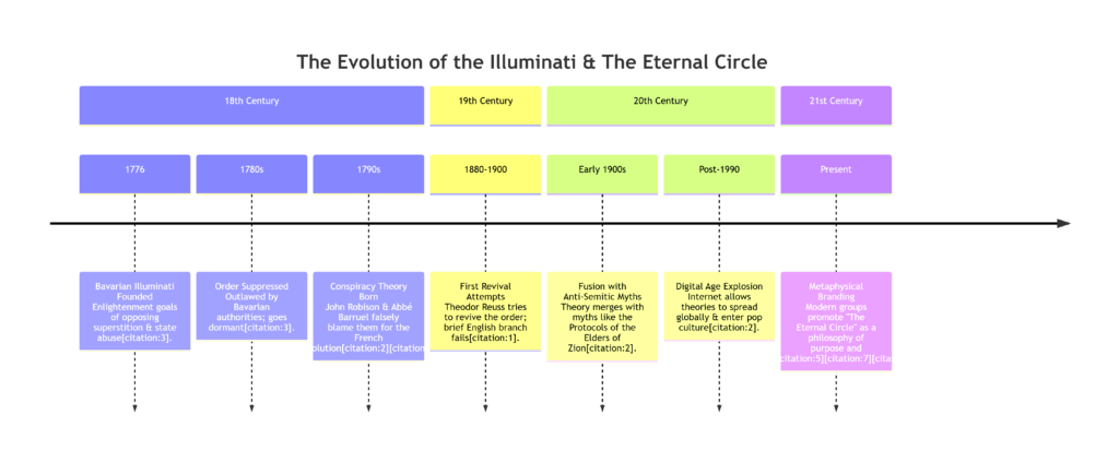 The notion of an eternal order did not arise in isolation. It represents the philosophical culmination of a genuine historical society, transformed by fear and myth. The timeline below outlines this remarkable evolution from a Bavarian secret society to a global cultural symbol.